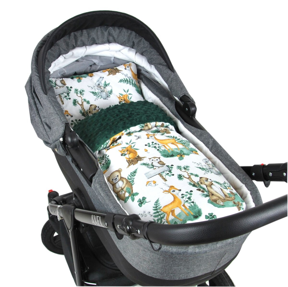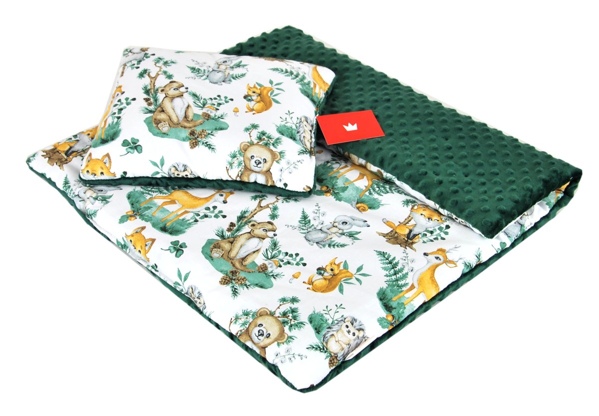 Polštářek + deka do kočárku minky - lesní zvířátka/ zelená